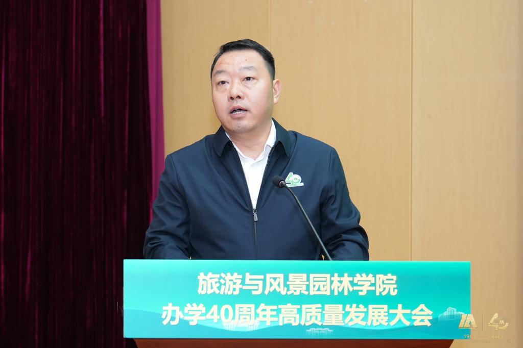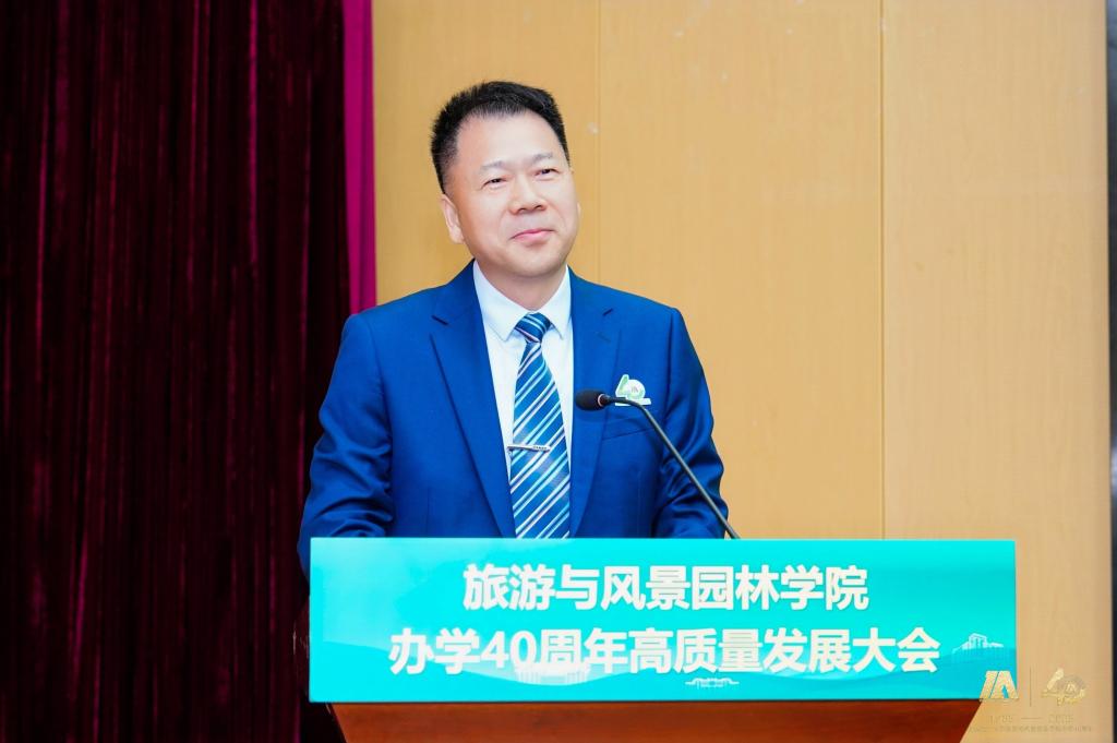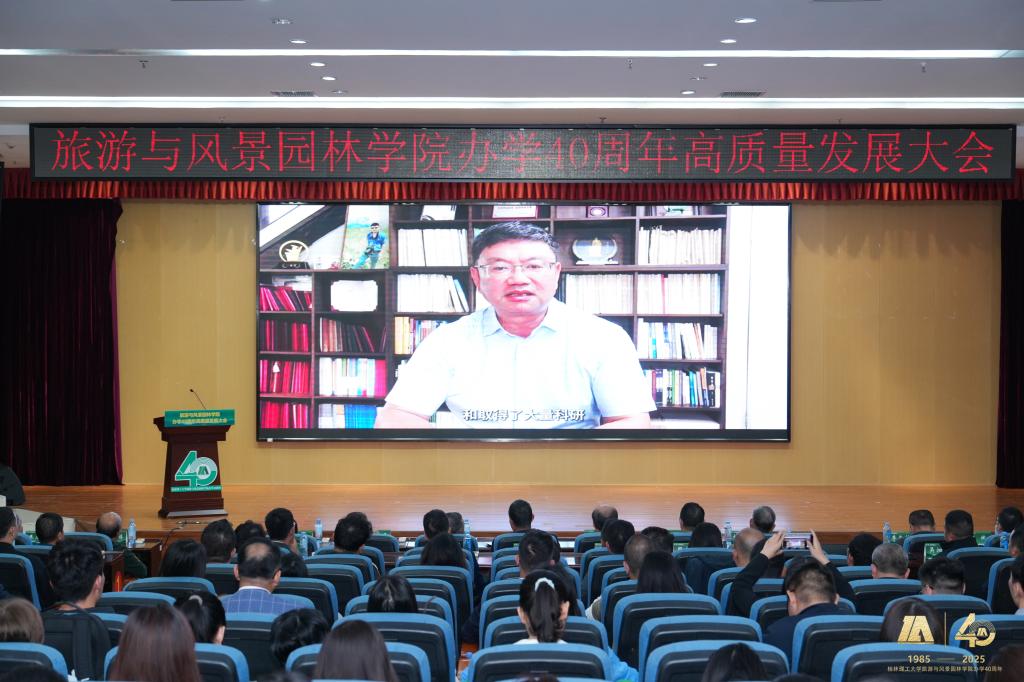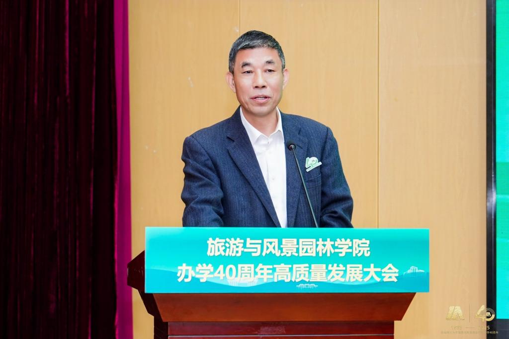 桂林旅游学院原校长、旅游与风景园林学院原院长程道品在大会发言。他深情回顾了在学院的工作经历,表达了对学院的深厚情谊与未来蓬勃发展的期许。