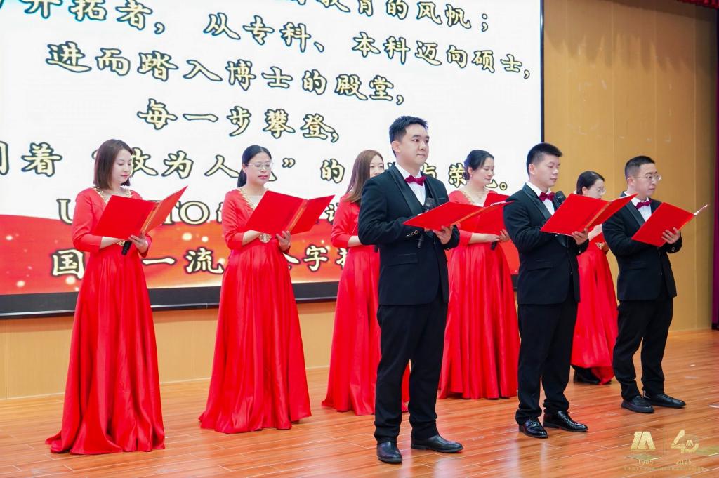 由学院教职工代表徐尤龙、蒋洁草等带来的散文朗诵《旅路芳华——礼赞学院办学四十年》,以深情的话语和动人的旋律,回顾了学院的发展历程,表达了对学院的热爱与祝福。
