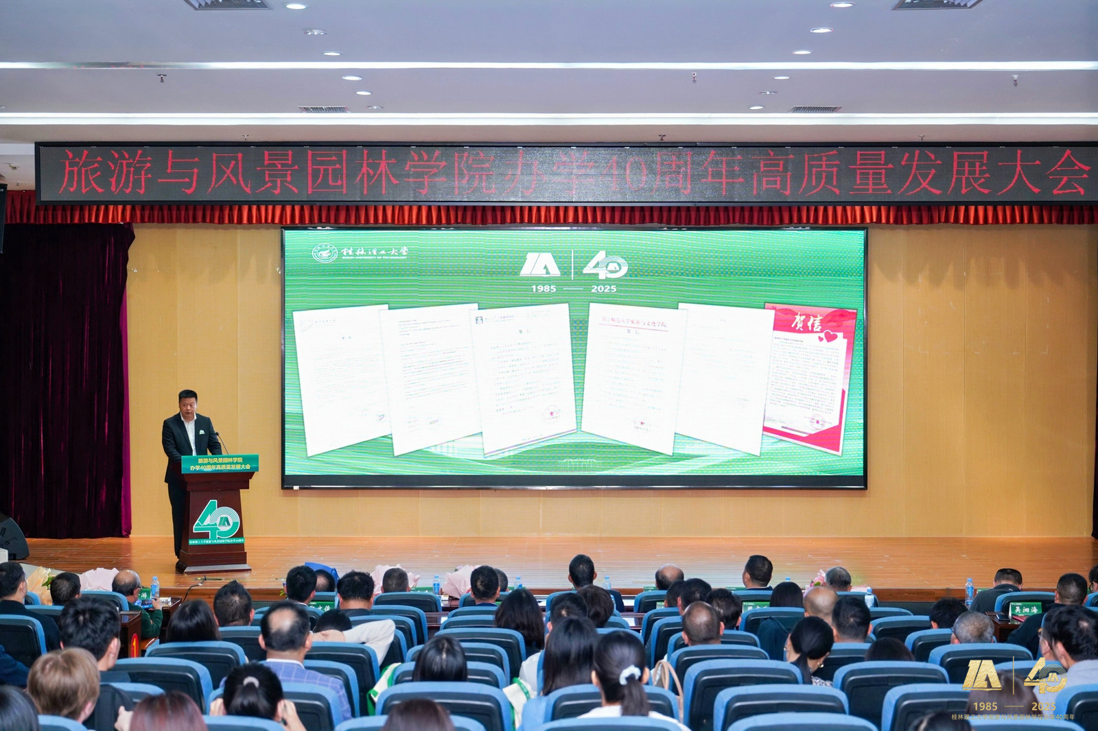 罗盛锋代表学校向学院办学40周年表示热烈祝贺,对学院在人才培养、科学研究、社会服务等方面取得的显著成绩给予了充分肯定。他指出,学院40年来扎根八桂大地,为国家培养和输送了数以万计的高素质专业人才。面向未来,他强调学院要深入贯彻学校第四次党代会精神,深化教育教学改革,提升科研创新能力,服务国家战略和地方经济社会发展。