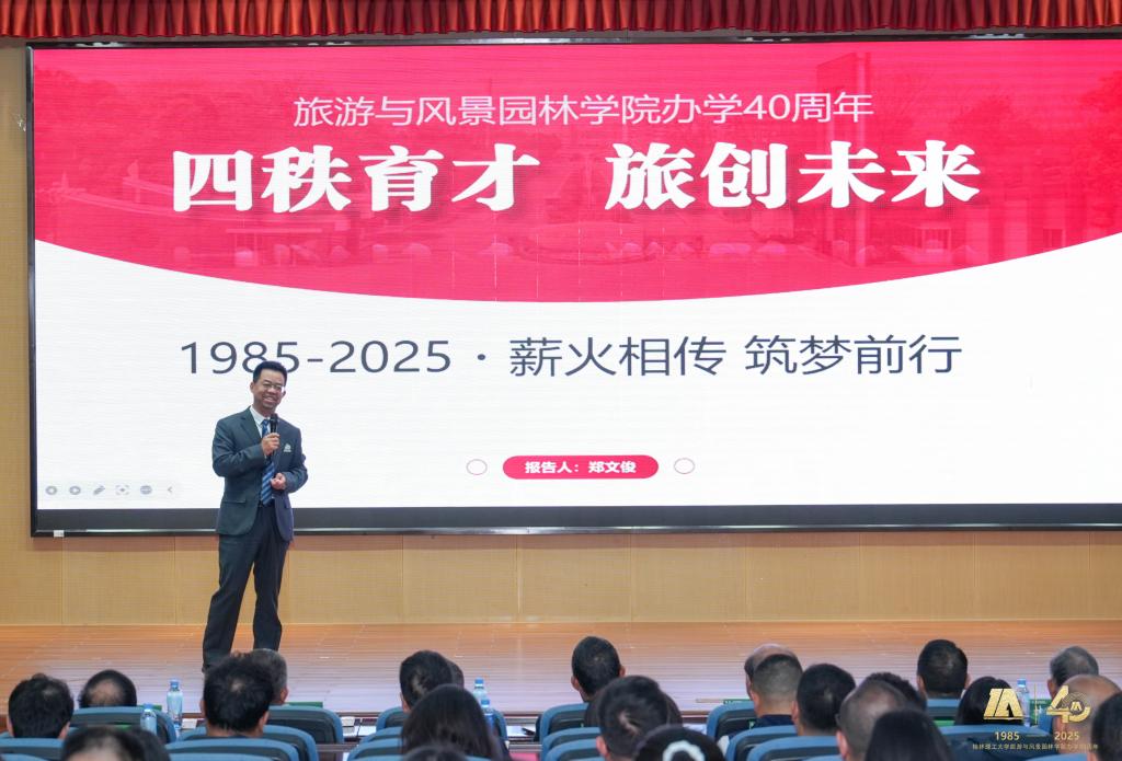 学院党委副书记、院长郑文俊以《四秩育才,旅创未来》为题作主题报告,系统梳理学院40年发展脉络与未来方向:40年来,学院从1985年初创至形成本-硕-博完整人才培养体系,在校生规模显著增长;专业建设成效突出,旅游管理、酒店管理通过UNWTO国际认证,城乡规划通过住建部评估,旅游管理专硕(MTA)获教育部“B+”评级;科研聚焦“智慧文旅+民族文化+山水保育”,累计获国家级项目70项、经费超8000万元;学生竞赛屡获国家级奖项。未来学院将以精神传承为根基,深化产教融合,推动科技赋能培育数字人才,拓展全球网络提升国际影响,全力建设特色鲜明、国内一流的学院。