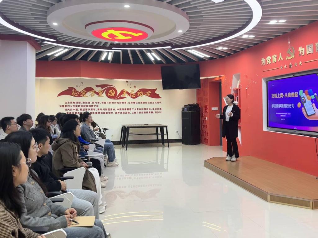 为深入学习宣传贯彻习近平法治思想,切实增强大学生网络安全意识和文明上网素养,11月14日,学院研究生第一党支部、研究生第二党支部、本科生第二党支部在嘉园思政大讲堂开展“文明上网・从我做起”主题党日活动。各支部学生党员参加活动。