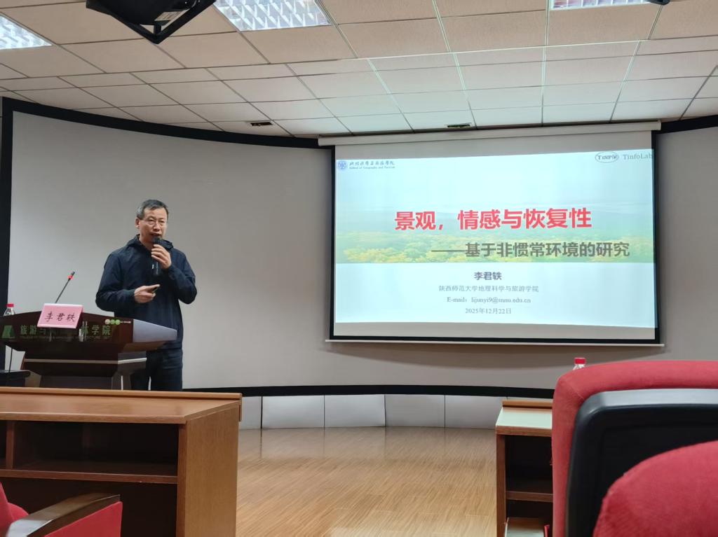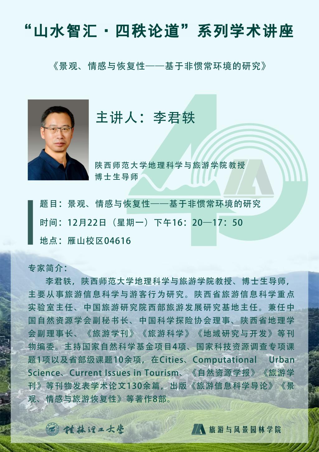 2025年12月22日,学院在雁山校区04616会议室举办“山水智汇·四秩论道”系列学术讲座。陕西师范大学地理科学与旅游学院教授、博士生导师李君轶应邀作题为《景观、情感与恢复性——基于非惯常环境的研究》学术报告,学院相关专业师生100余人参加讲座。