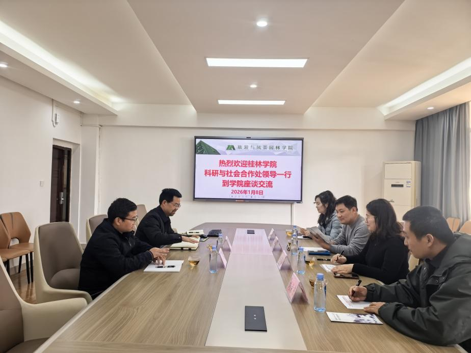 2026年1月8日,桂林学院科研与社会合作处肖立章处长、赵莉莉处长等一行莅临我院交流。学院院长郑文俊、副院长王荣在雁山校区4509会议室热情接待了来访客人,双方围绕科研项目申报、科研制度建设、科研成果转化与社会服务等多领域合作展开深入座谈。