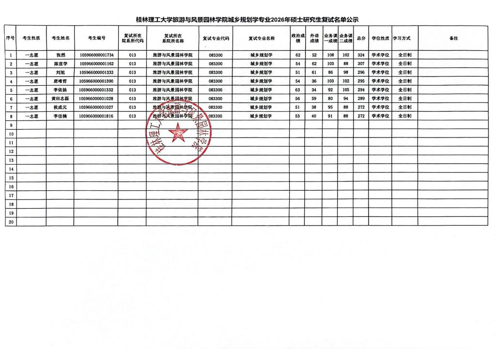 桂林理工大学旅游与风景园林学院城乡规划学专业2026年硕士研究生复试名单公示