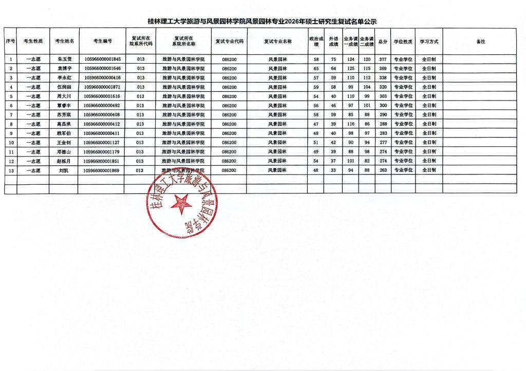 桂林理工大学旅游与风景园林学院风景园林专业2026年硕士研究生复试名单公示