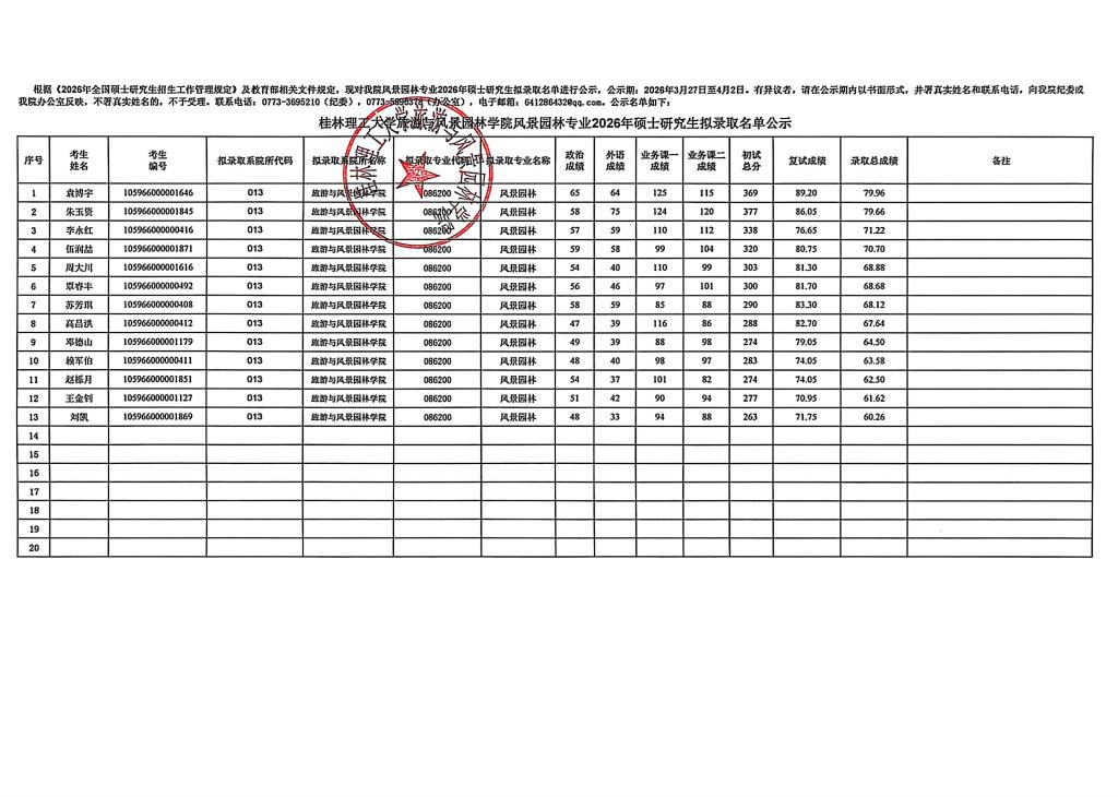 桂林理工大学旅游与风景园林学院风景园林专业2026年硕士研究生拟录取名单公示