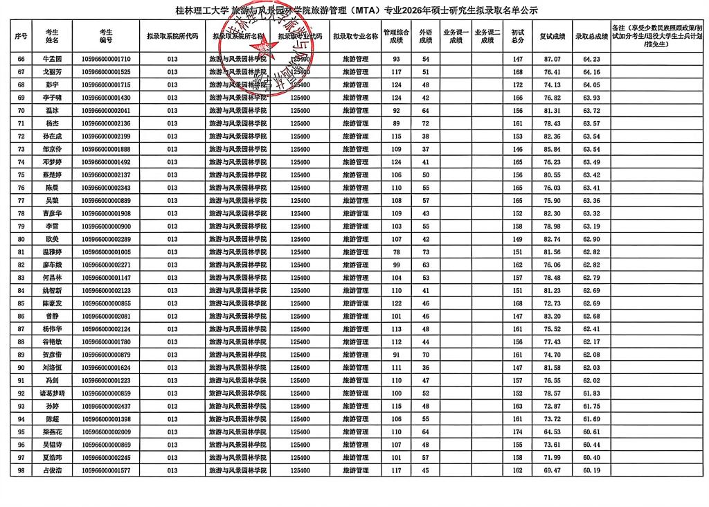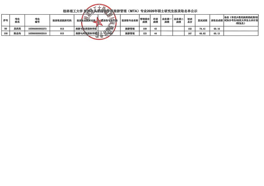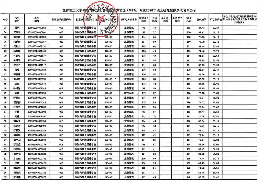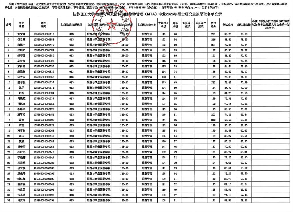 桂林理工大学旅游与风景园林学院旅游管理(MTA)专业2026硕士研究生拟录取名单公示