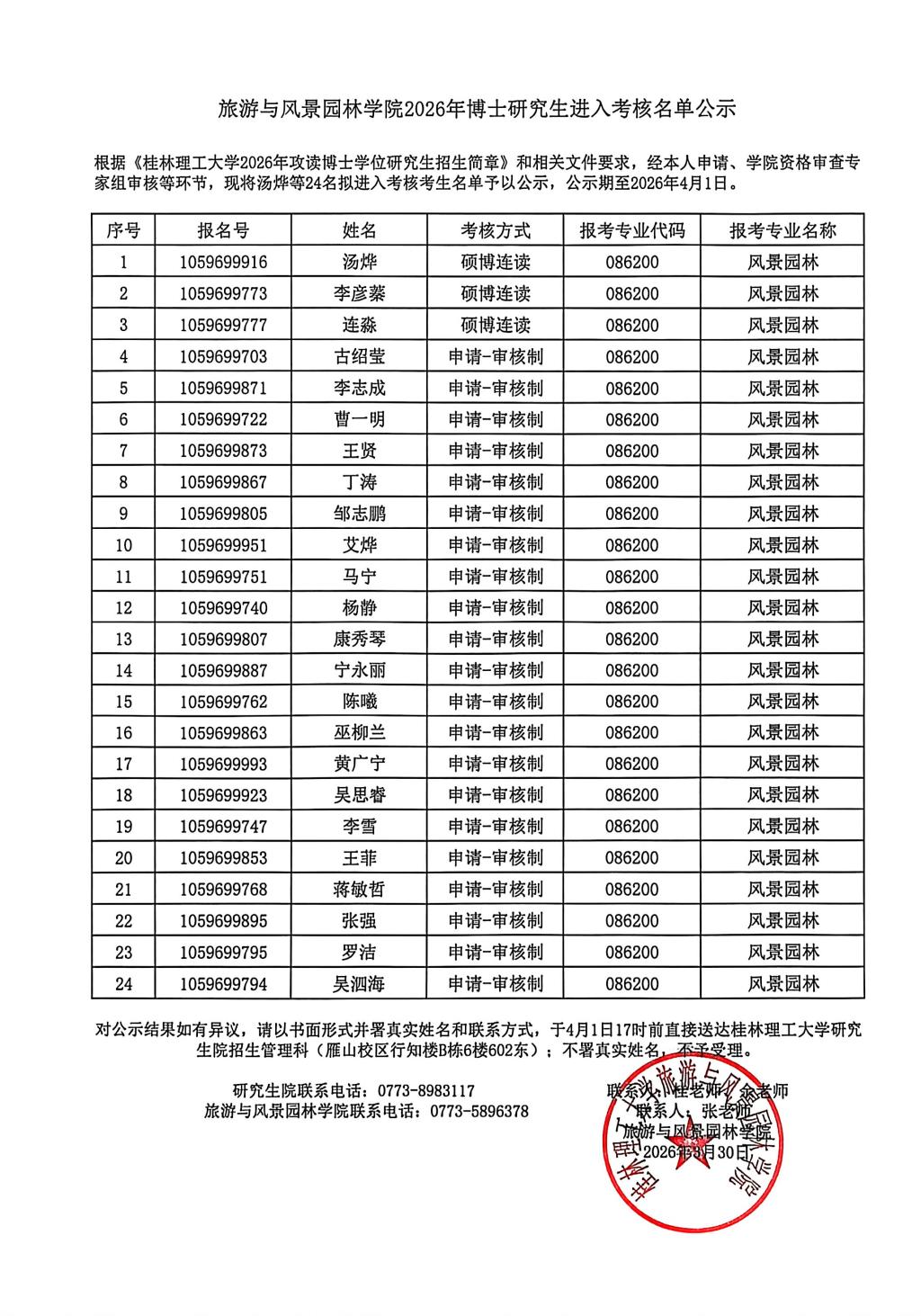 旅游与风景园林学院2026年博士研究生进入考核名单公示