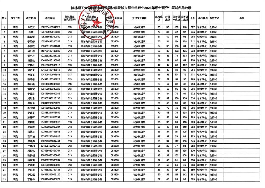 桂林理工大学旅游与风景园林学院城乡规划学专业2026年硕士研究生复试名单公示