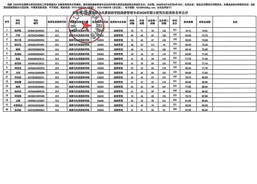 桂林理工大学旅游与风景园林学院旅游管理专业2026年硕士研究生拟录取名单公示