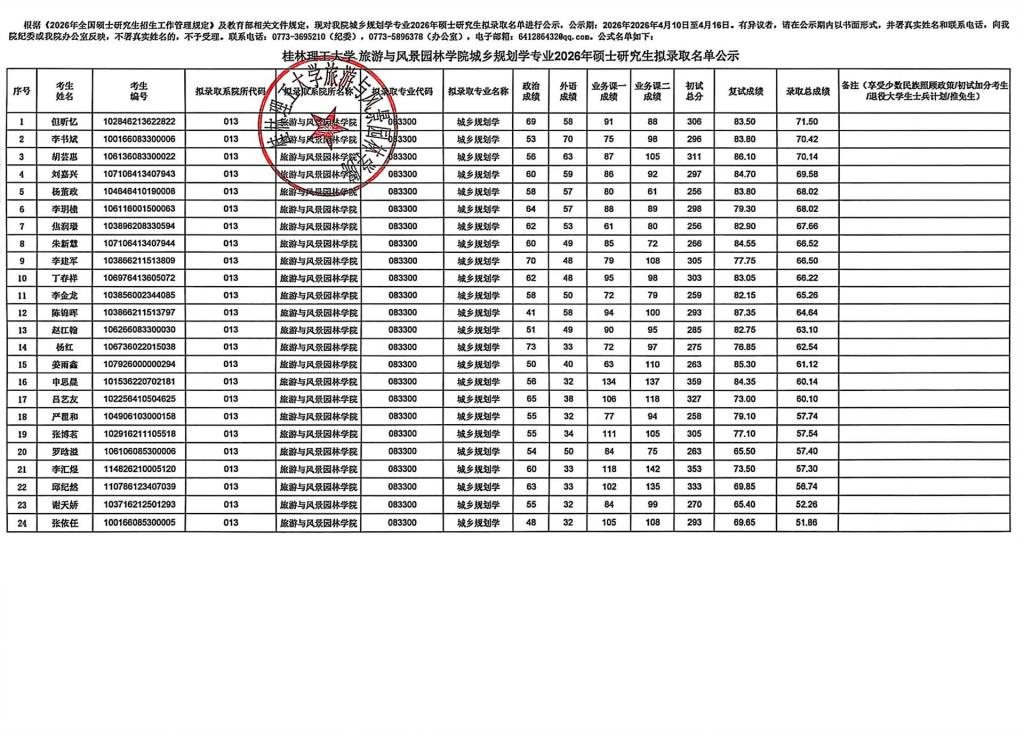 桂林理工大学旅游与风景园林学院城乡规划学专业2026年硕士研究生拟录取名单公示