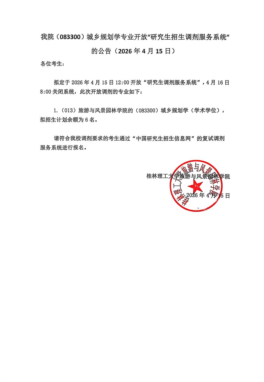 我院(083300)城乡规划学专业开放“研究生招生调剂服务系统”的公告