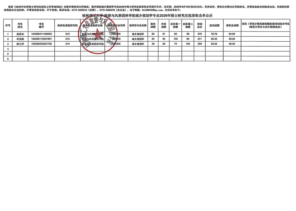 桂林理工大学旅游与风景园林学院城乡规划学专业2026年硕士研究生拟录取名单公示