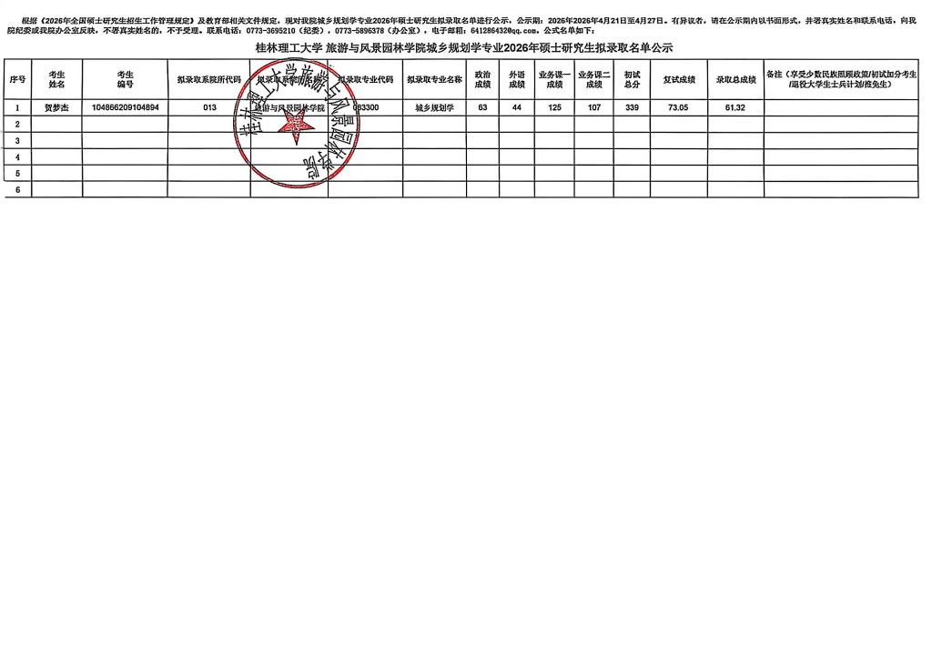 桂林理工大学旅游与风景园林学院城乡规划学专业2026年硕士研究生拟录取名单公示
